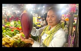その後、人気観光スポットのひとつでもあり、地元の人々も多く利用する「オールドマーケット」を、現地のマカラーさんと愛さんの案内で散策しました。野菜、果物、肉、魚、乾物など様々なものが売られており、なんと、豚の顔も売られていました。また、マカラーさんの顔の大きさを超えるバナナの花もありました。お供え物やおやつとして人気のある緑豆、もち米をバナナの葉で包み、蒸したお菓子「ノムコーム」を、マカラーさんが食レポしてくれました。日曜日の朝ということもあり、マーケット内のごはん屋さんも多くの人でにぎわっており、市場の活気を感じました。