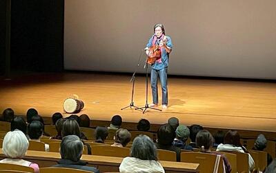 また映画の中では、東ティモールの人々の歌と音楽が随所に登場しました。その“音の世界”を、音楽監修者の小向サダムさん自らギターや太鼓を使って再現してくださり、心に沁みる歌声がホールに響き渡りました。癒しと感動が溶け合う素晴らしい時間となりました。