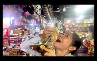 その後、人気観光スポットのひとつでもあり、地元の人々も多く利用する「オールドマーケット」を、現地のマカラーさんと愛さんの案内で散策しました。野菜、果物、肉、魚、乾物など様々なものが売られており、なんと、豚の顔も売られていました。また、マカラーさんの顔の大きさを超えるバナナの花もありました。お供え物やおやつとして人気のある緑豆、もち米をバナナの葉で包み、蒸したお菓子「ノムコーム」を、マカラーさんが食レポしてくれました。日曜日の朝ということもあり、マーケット内のごはん屋さんも多くの人でにぎわっており、市場の活気を感じました。