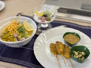 献立:カオソーイ(ココナッツカレーのスープ麺)、ムー・サテ(豚肉の串焼き)、ルァムミット(タイ風みつ豆)