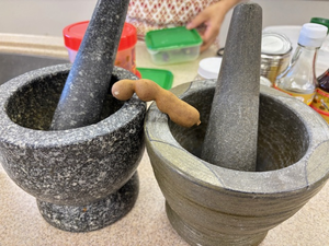 講師が持参した「クロック(タイ料理で使われる伝統的な調理器具)」を使って、香辛料や食材を何度も叩いて潰す工程も体験しました。タイの家庭料理の奥深さを感じる、貴重な時間となりました。