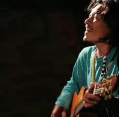 また映画の中では、東ティモールの人々の歌と音楽が随所に登場しました。その“音の世界”を、音楽監修者の小向サダムさん自らギターや太鼓を使って再現してくださり、心に沁みる歌声がホールに響き渡りました。癒しと感動が溶け合う素晴らしい時間となりました。