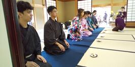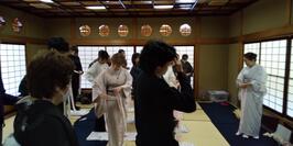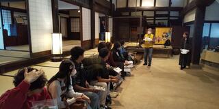 午後からは、つづれの会の皆さまのご協力のもと、日本庭園の和室で浴衣着付け体験を実施しました。「自分で着る浴衣」に皆さん苦戦していましたが、先生方に助けていただきながら、なんとか着付けを終えることができました。浴衣姿でいただくお茶とお菓子は特別な経験となったようです。正座が苦手な学生が多かったものの、最初と最後だけはきちんと正座をしてお礼をしました。
