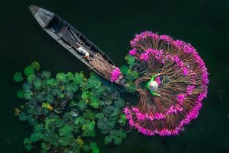 ベトナムの睡蓮の花の収穫の風景の一コマで、とても幻想的なワンシーンに仕上げているのがとても魅力的です。深い緑の水面に集められたピンク色の睡蓮が、見るものにインパクトを与えると同時に綺麗に集められた睡蓮の造形の美しさに引き込まれます。普段目にすることのない真上からアングルでの撮影が、この美しさを一段と引き上げている素晴らしい作品です。