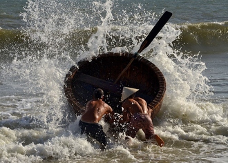 とにかく力強さが伝わってくるダイナミックな瞬間をとらえた作品です。竹や籐などの自然素材を編んで作られ籠舟は波の荒い海でも安定して動けるため、漁師たちにとって非常に頼もしい存在なのだと思います。荒波に向かう筋肉隆々の漁師の後姿は、自然との闘いと共生を感じさせてくれる瞬間を捉えています。無駄のない臨場感ある構図で切りとることで、より被写体の力強さを感じる作品です。