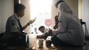 日本語パートナーズ事業で訪れたパダン。先生と日本語クラブのみんなで現地の郷土料理を作っていた時、おサボりさんがいました。