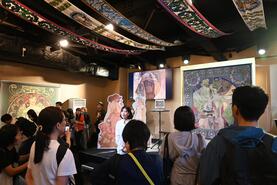 ▸ミュシャ作品「クオ・ヴァディス」を原画とする堺緞通や、「サラ・ベルナール」の原画及び草花の装飾柄の注染反物、「黄道十二宮」を原画とする堺刃物彫金作品等