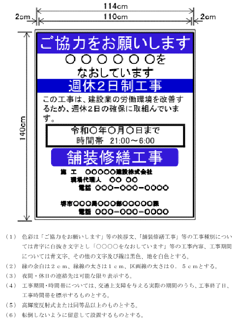道路における工事については、この限りではない。 なお、標示板の設置にあたっては、別表様式1を参考とするものとする。