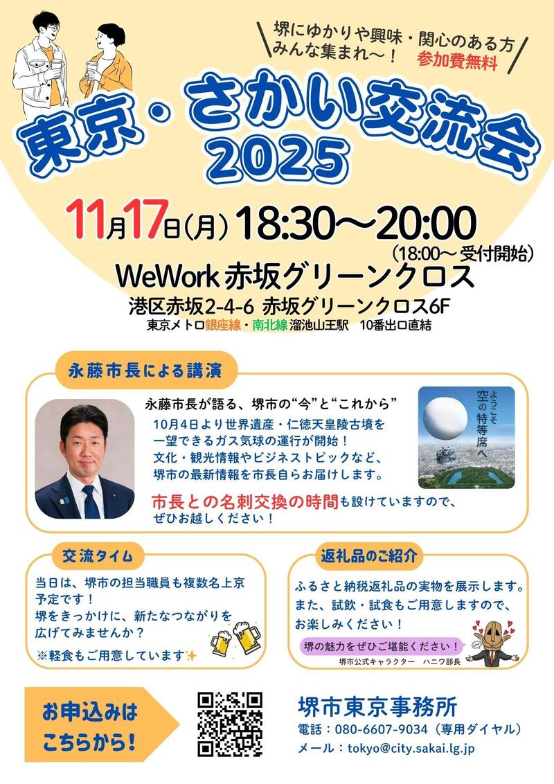 今回知り得た個人情報は、当イベントについてのご連絡のほか、堺市東京事務所が主催するイベントのご案内に限り使用させていただきます。
