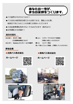 - ハローワーク堺、市、府が、バス業界やバス運転士の仕事を紹介する職業説明会&座談会を開催します。