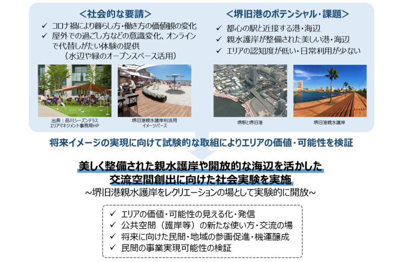 堺都心未来創造ビジョンにおいて示す堺旧港周辺の将来イメージを実現するには、エリアの価値や可能性を高める取り組みを試験的に実施し、その効果を検証しながら段階的に取り組みを進めていく必要があります。
