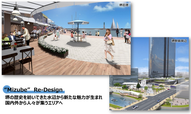 以下のパースは、令和5年(2023)年5月公表の「堺都心未来創造ビジョン」において、“Mizube” Re-designをコンセプトに描いた、堺旧港及び堺駅周辺の将来像です。