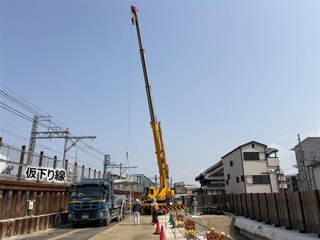 仮下り線への切替えに向け、土留め矢板を打設しています。
