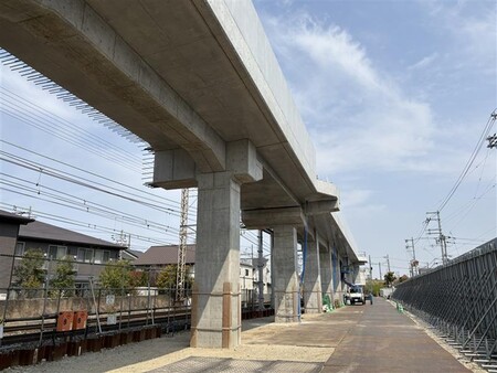 阪堺線より南側にて、高架構造物の柱の立上げを行っています。(2024年12月時点の場所より少し北側の地点にて撮影)