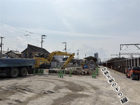 仮下り線を敷設するため、旧上り線のホームや線路の改修工事を行っています。