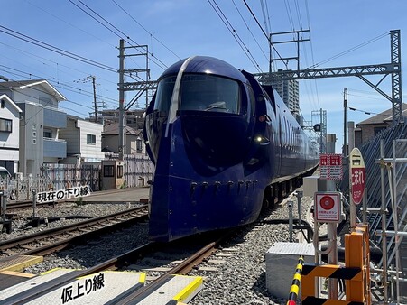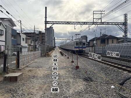 高石市側との接続部にて、仮上り線への切り替えに向け、仮上り線の敷設が完了しました。今後、設備工事に着手していきます。