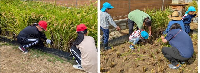 令和7年6月9日(月曜)に、堺市北区にあるふくろうの森学園の園庭内の田んぼで園児と堺市立少林寺小学校の児童が協力し田植えを行い、10月6日(月曜)に収穫を行いました。