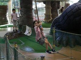 巨大なワニの遊具の中で遊べる「マチカネワニの生体」や「マチカネワニの骨格」、ジャングルの動物たちの鳴き声が楽しめる「ワニタンの音広場」、ロープウェイや木登りができる「ジャングルの冒険」などがあります。