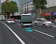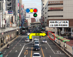 堺東駅前交差点の右折進入において、道路側にセンサーを設置し自動運転システムと連携することで、自動運転車両の車載センサーの死角部分をカバーし、交差点右折の手動介入低減について検証します。(実施主体:国土交通省道路局)