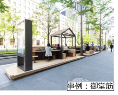 歩行空間内に休憩スペースを創設し、利用者数、利用状況を測定し、バス待合環境の向上について検証します。また、デジタルデバイスを活用した情報発信を実施し、バス待合環境の向上や、周辺店舗の利用について、アンケートによる効果測定を実施します。