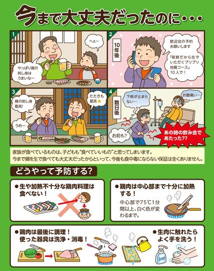 新鮮でも、菌が付着した鶏肉を生又は加熱不十分な状態で食べると発症します。