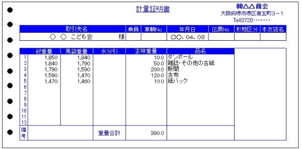 - 計量票とは、回収業者が回収した古紙等を引き渡す際に問屋で発行されるもので、計量法で定められた定期検査に合格した計量器で計量し、印字されたものに限ります(手書き・コピーしたものなどは不可)。